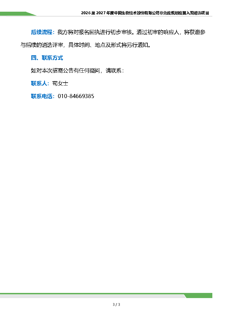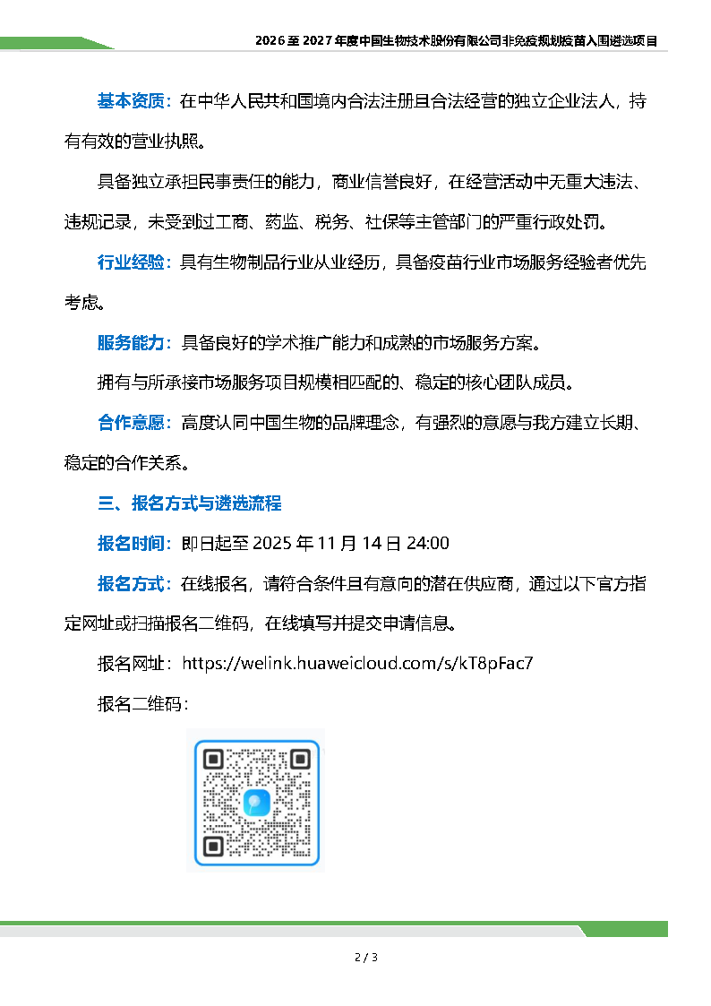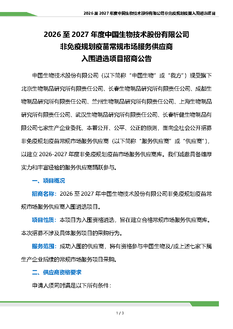 2026 至 2027 年度中國生物技術(shù)股份有限公司非免疫規(guī)劃疫苗常規(guī)市場服務(wù)供應(yīng)商入圍遴選項目招商公告